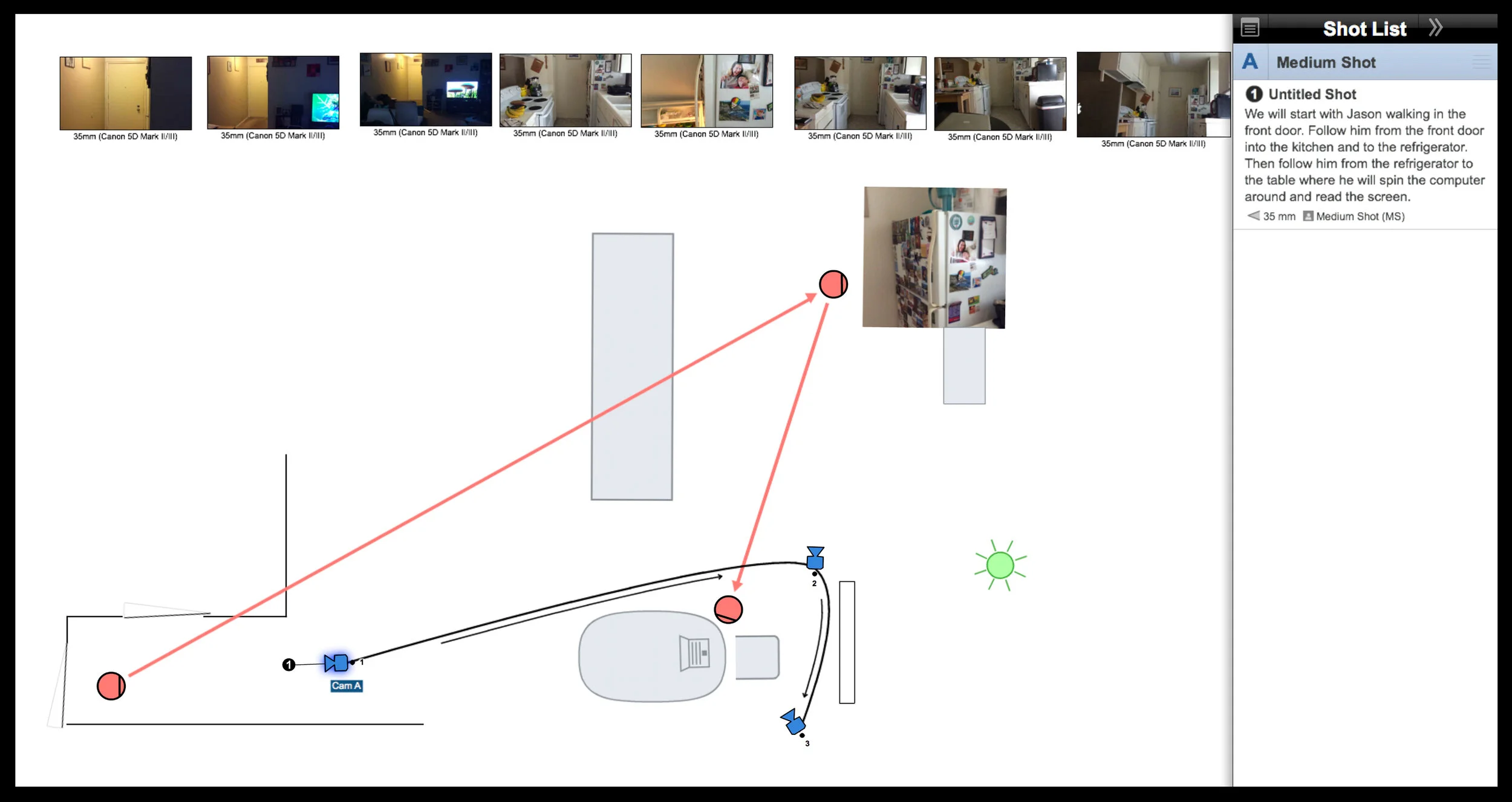 There is only one actor for “Exercise,” but I still want to show how his scenes are going to be broken down. There is a lot of him just running out of the house and checking his computer. So I fit all this around the location, and we planned out what action was taking place at what spots.